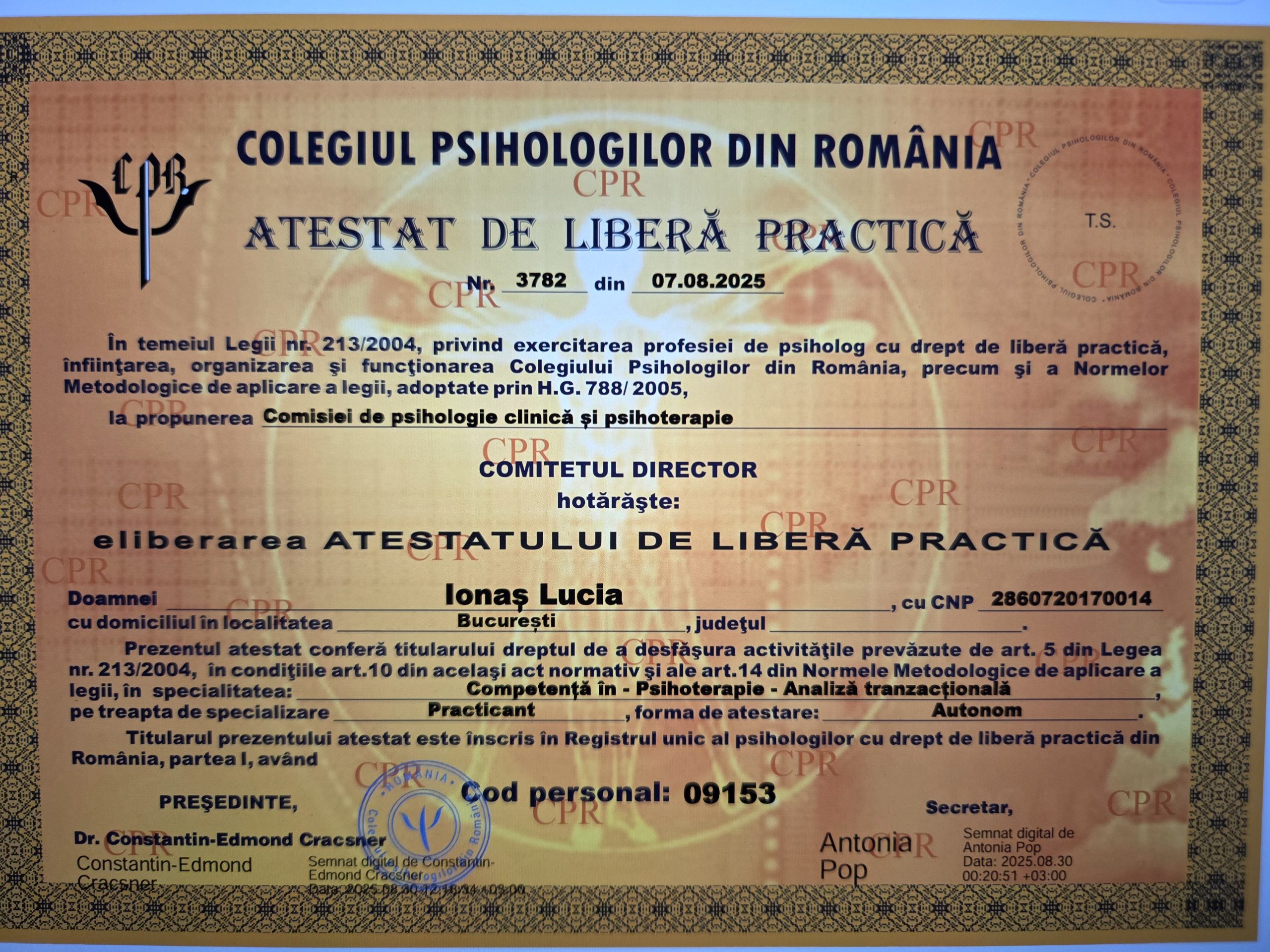 Acreditare Colegiul Psihologilor în AT: Da - Psiholog cu drept de liberă practică: Practicant - Autonom (Psihoterapie - Analiză Tranzacțională) - cod R.U.P. 09153
